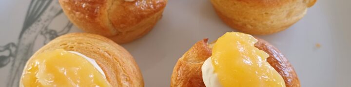 De clotted cream en extra lemon curd kun je los bij de cruffins serveren, maar je kunt ze ook vullen.