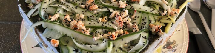 Versier de taart met de komkommerlinten, de rest van de mango en rivierkreeftjes, de wasabi en het sesamzaad.