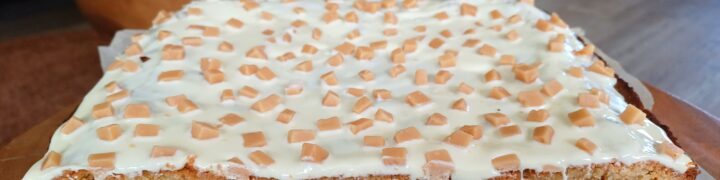 Tip: bewaar de taart niet in de koelkast, want dan wordt de karamel erg hard en is de taart moeijlik aan te snijden.