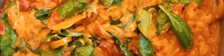 Roer de orzo, een snuf zout en 150 ml water door de saus en laat deze, onder af en toe doorroeren, 8 min zachtjes doorkoken met de deksel op de pan.